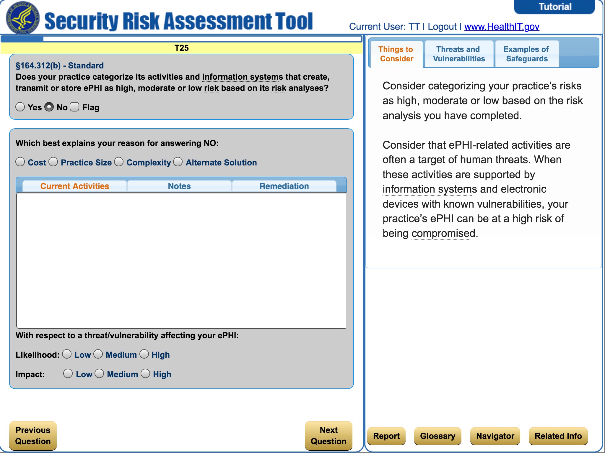 “Does your practice periodically complete an accurate and thorough risk analysis, such as upon occurrence of significant event or change in your business organization or environment?” Each question is answerable by yes, no or flag. When you click any of the options, the question expands and allows you to elaborate on the answer: